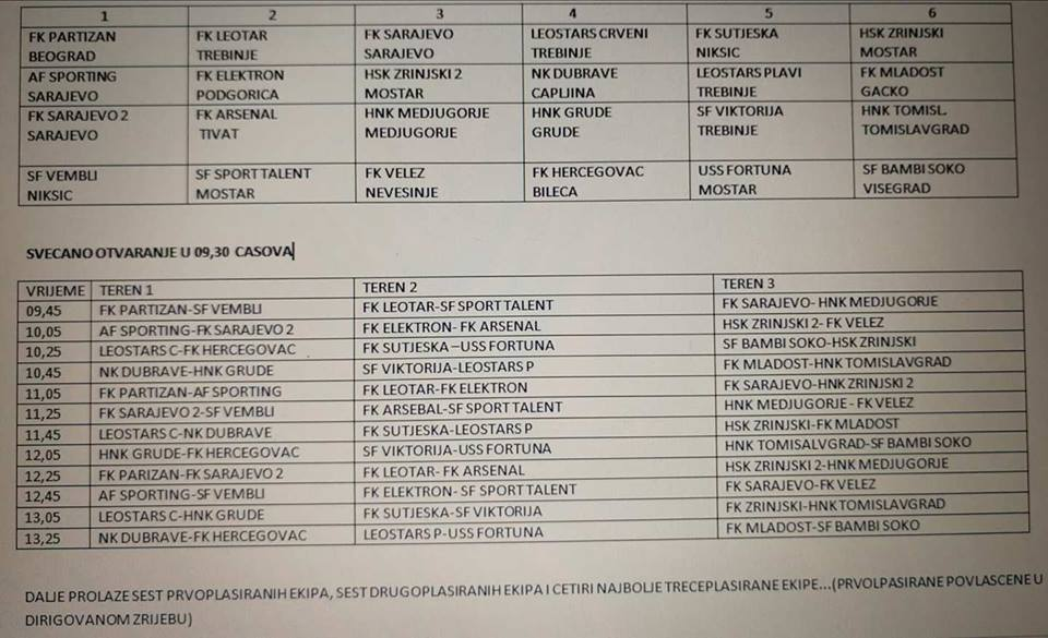 Turnir "Fudbalske zvijezdice 2017." koji se organizuje na gradskom stadionu "Police" u Trebinju održaće se u nedelju 3.09.2017. godine. Turnir čiji je organizator Škola fudbala "LeoStars", namenjen je dečacima rođenim 2008. godine i mlađim i ove godine, okupiće čak 24 ekipa iz tri države, koje će biti raspoređene u šest grupa. Turnir se igra po sistemu 6+1, na terenu dimenzija 50X30 metara, sa trajanjem utakmice od 20 minuta na golove dimenzija 5X2 metra. Svečano otvaranje turnira je u nedjelju sa početkom u 9.30 časova, a prve utakmice će se odigrati već u 9.45 časova.